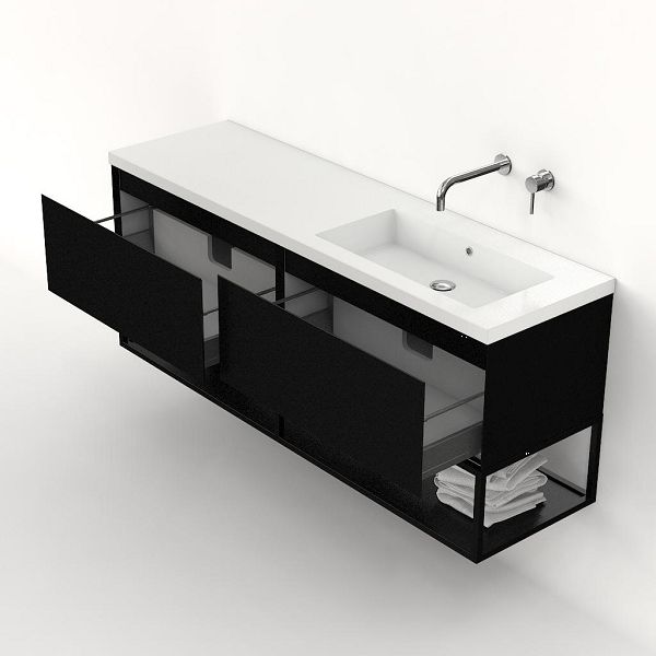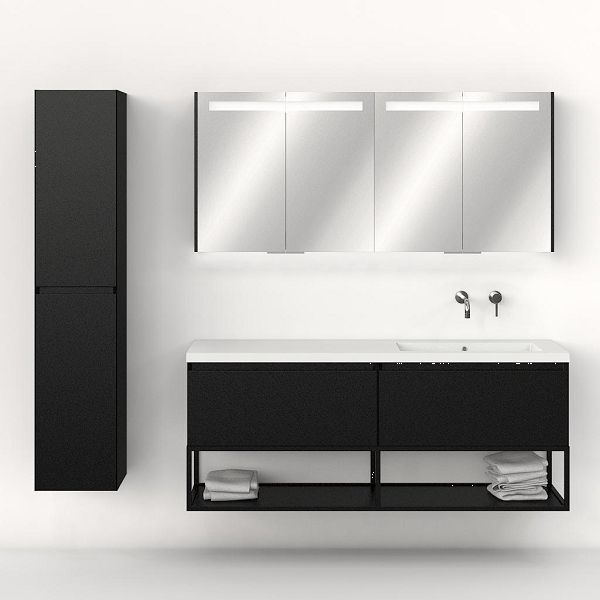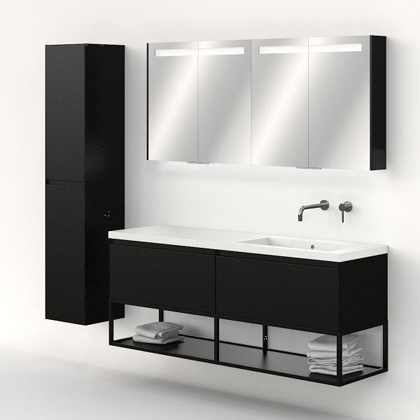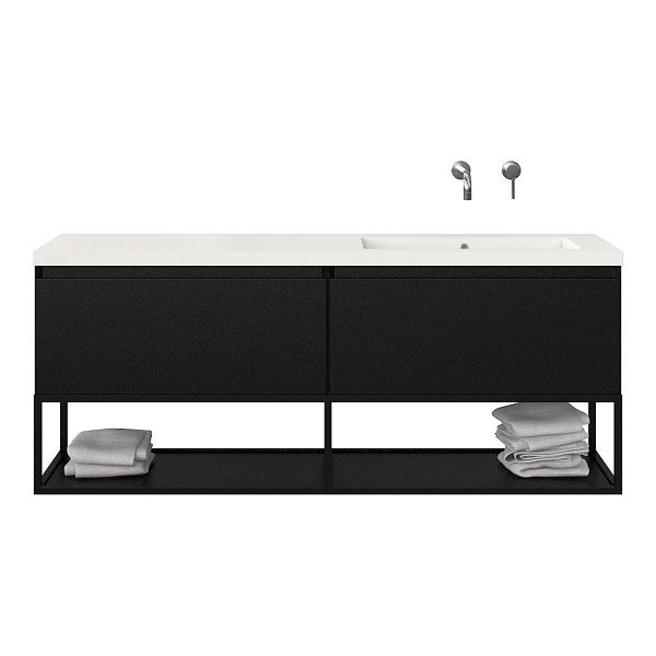 Greeploos badkamermeubel in de kleur zwart mat is 160 cm breed.  De wastafel is vervaardig in polystone en heeft de kleur wit. Dit badkamermeubel met deze wastafel is leverbaar tussen de 60 cm t/m 160 cm