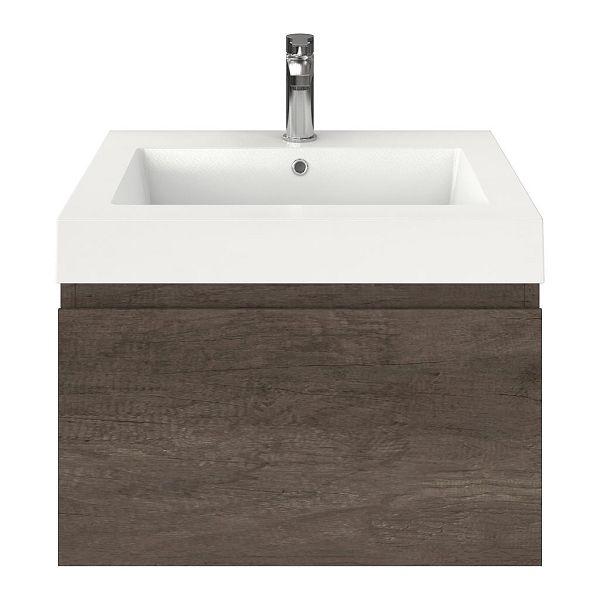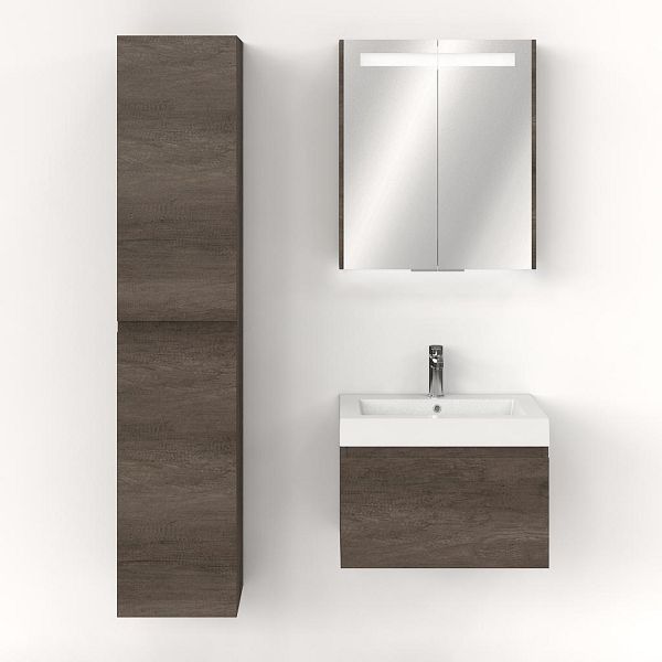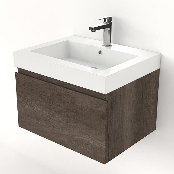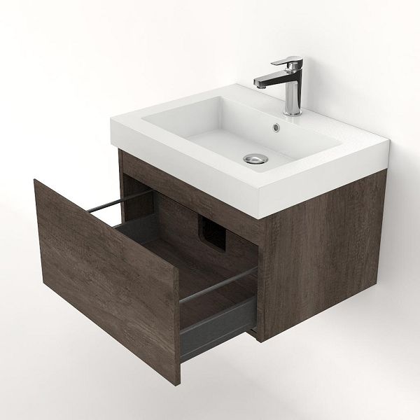 Greeploos badkamermeubel in de kleur olm donker grijs is 60 cm breed. De wastafel is vervaardig in polystone en heeft de kleur wit. Dit badkamermeubel met deze wastafel is leverbaar tussen de 60 cm t/m 160 cm