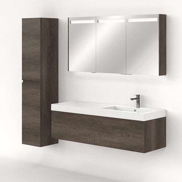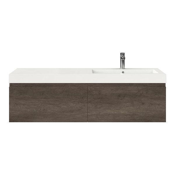 Greeploos badkamermeubel in de kleur olm donker grijs is 140 cm breed.  De wastafel is vervaardig in polystone en heeft de kleur wit. Dit badkamermeubel met deze wastafel is leverbaar tussen de 60 cm t/m 160 cm