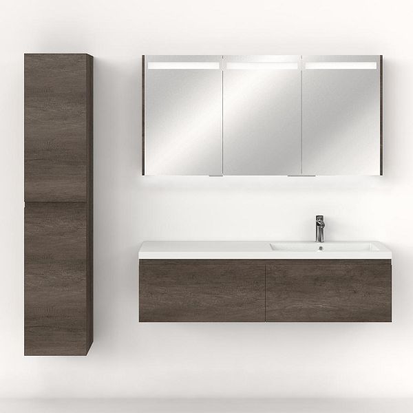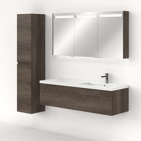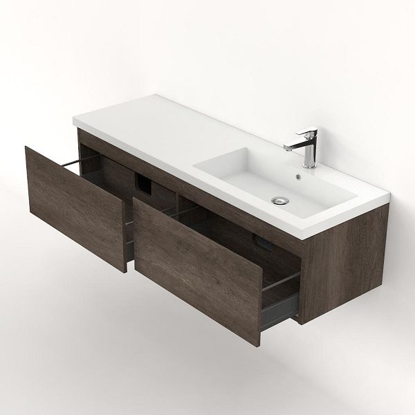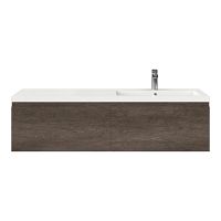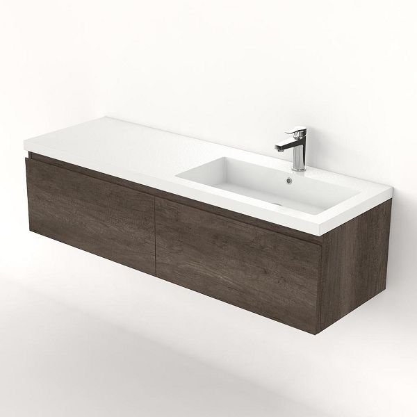 Greeploos badkamermeubel in de kleur olm donker grijs is 140 cm breed.  De wastafel is vervaardig in polystone en heeft de kleur wit. Dit badkamermeubel met deze wastafel is leverbaar tussen de 60 cm t/m 160 cm
