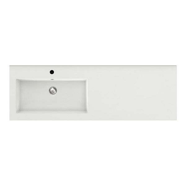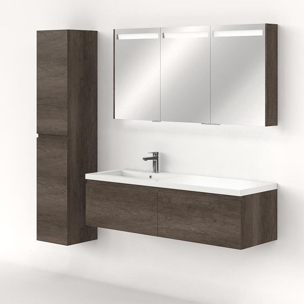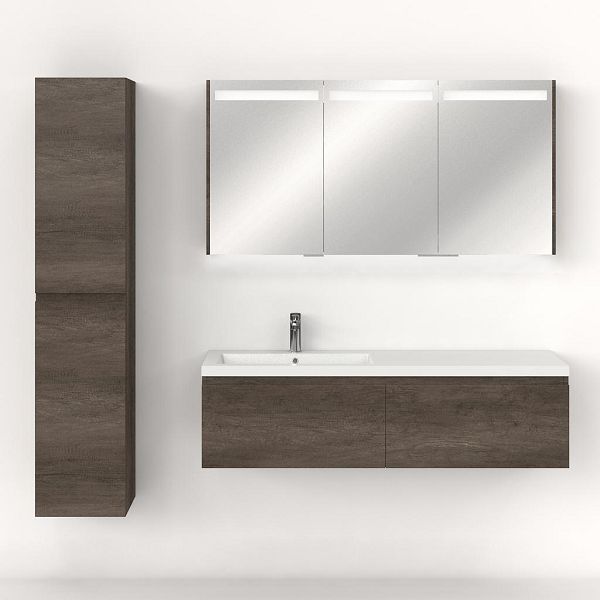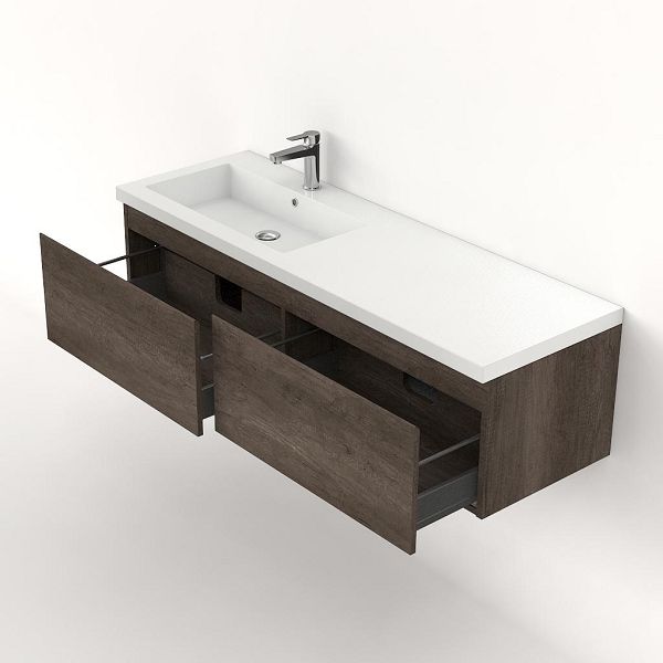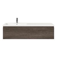 Greeploos badkamermeubel in de kleur olm donker grijs is 140 cm breed. De wastafel is vervaardig in polystone en heeft de kleur wit. Dit badkamermeubel met deze wastafel is leverbaar tussen de 60 cm t/m 160 cm