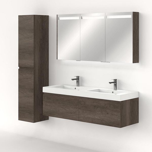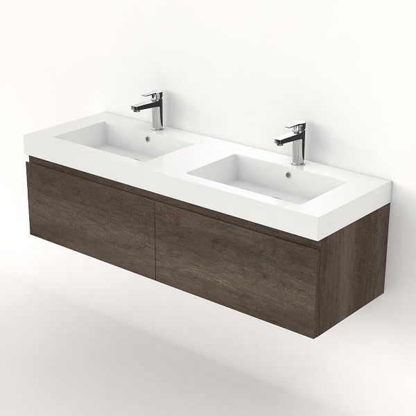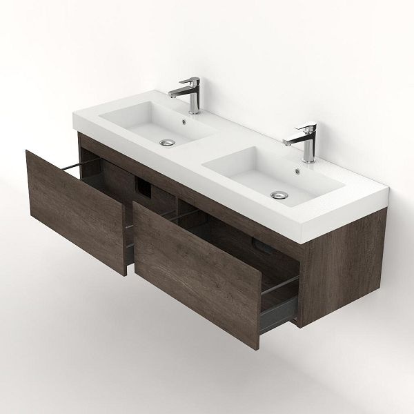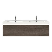 Greeploos badkamermeubel in de kleur olm donker grijs is 140 cm breed. De wastafel is vervaardig in polystone en heeft de kleur wit. Dit badkamermeubel met deze wastafel is leverbaar tussen de 60 cm t/m 160 cm