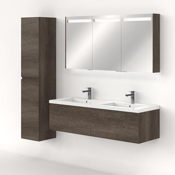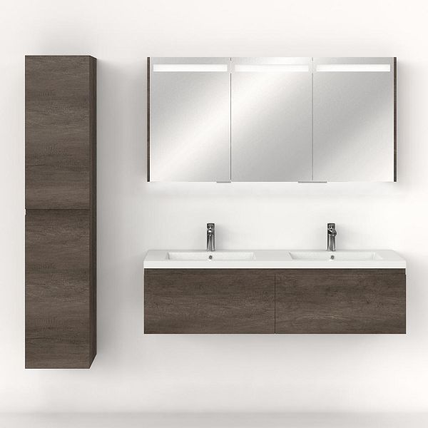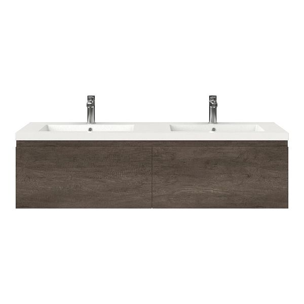 Greeploos badkamermeubel in de kleur olm donker grijs is 140 cm breed. De wastafel is vervaardig in polystone en heeft de kleur wit. Dit badkamermeubel met deze wastafel is leverbaar tussen de 60 cm t/m 160 cm