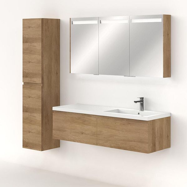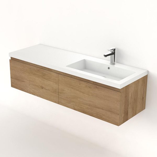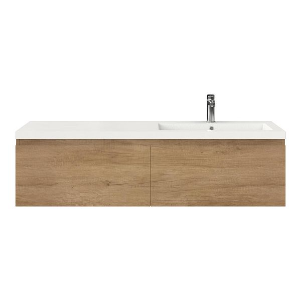 Greeploos badkamermeubel in de kleur olm is 140 cm breed.  De wastafel is vervaardig in polystone en heeft de kleur wit. Dit badkamermeubel met deze wastafel is leverbaar tussen de 60 cm t/m 160 cm