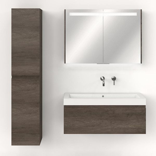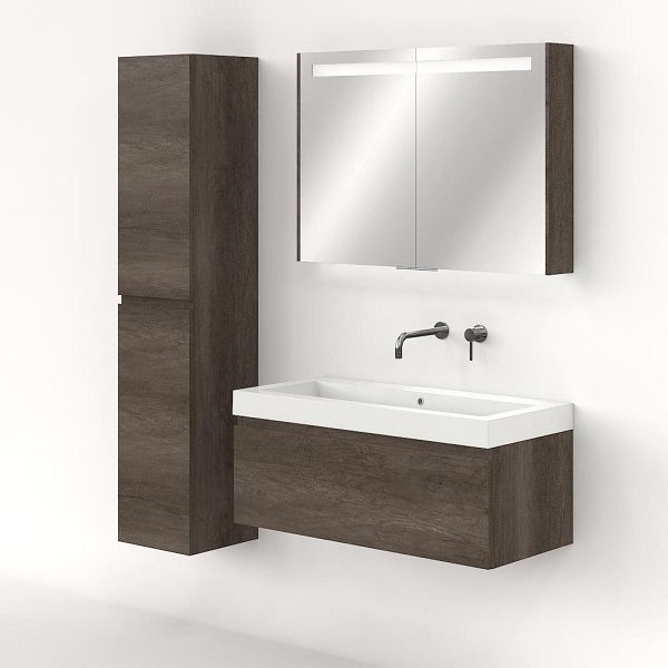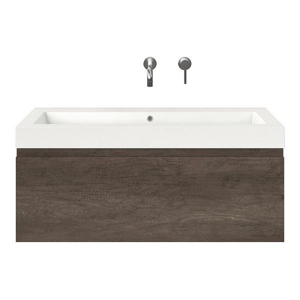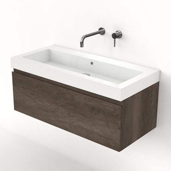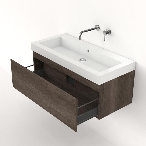 Greeploos badkamermeubel in de kleur olm donker grijs is 100 cm breed.  De wastafel is vervaardig in polystone en heeft de kleur wit. Dit badkamermeubel met deze wastafel is leverbaar tussen de 60 cm t/m 160 cm