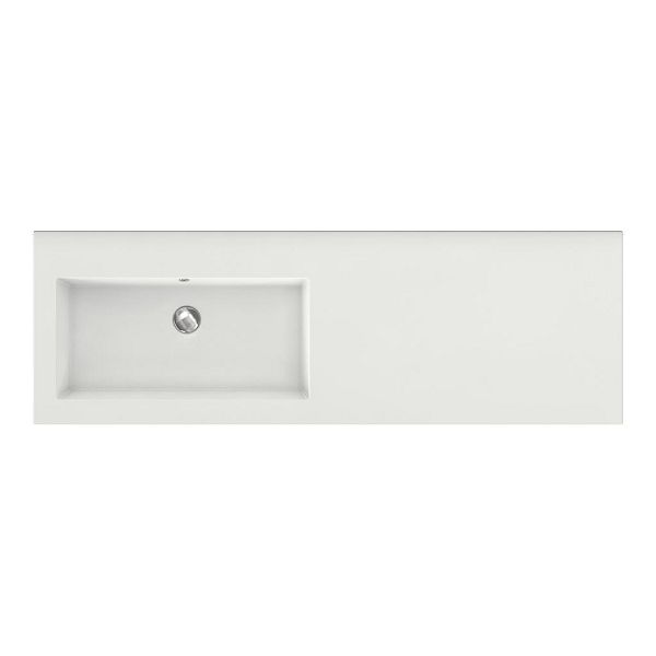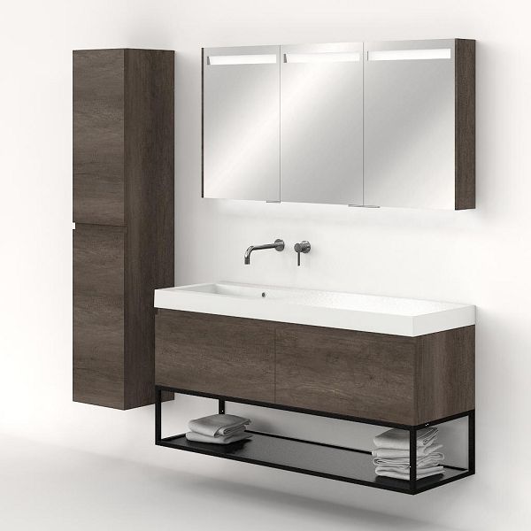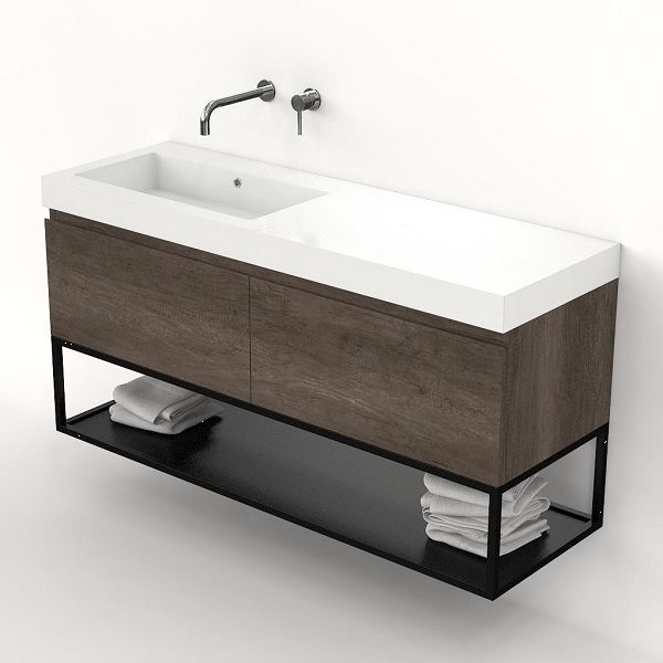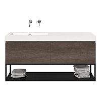 Greeploos badkamermeubel in de kleur olm donker grijs is 140 cm breed.  De wastafel is vervaardig in polystone en heeft de kleur wit. Dit badkamermeubel met deze wastafel is leverbaar tussen de 60 cm t/m 160 cm