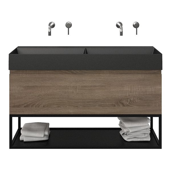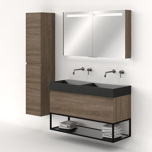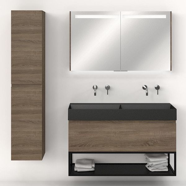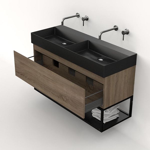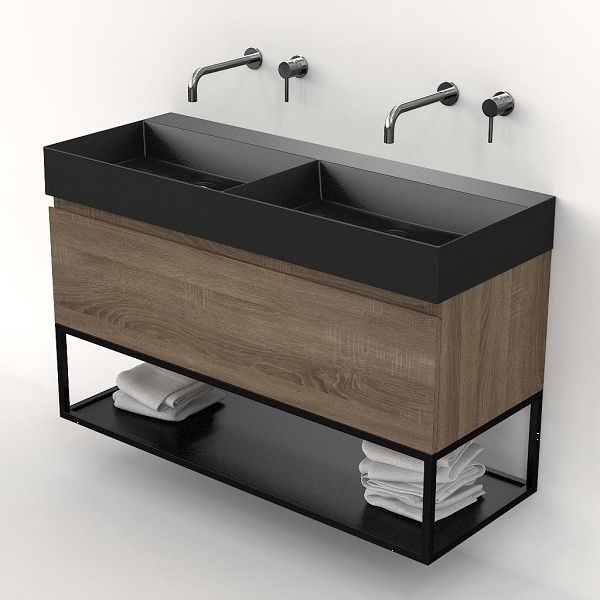 | | Bellanti Solo/Tela/Azzurra badmeubel 120x46 1 softclose lade eiken donker greeploos keramische wastafel dubbel antraciet mat zonder kraangaten met mat zwart metalen frame |