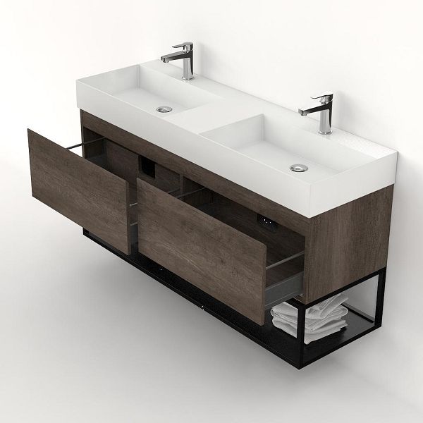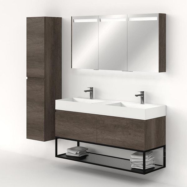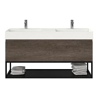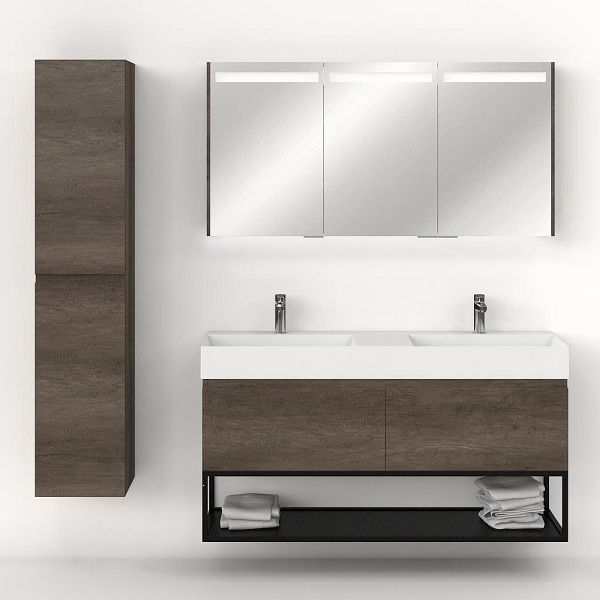 | Bellanti Solo/Tela/Azzurra badmeubel 140x46 2 softclose laden olm donker grijs greeploos keramische wastafel dubbel wit glans met 2 kraangaten met mat zwart metalen frame |