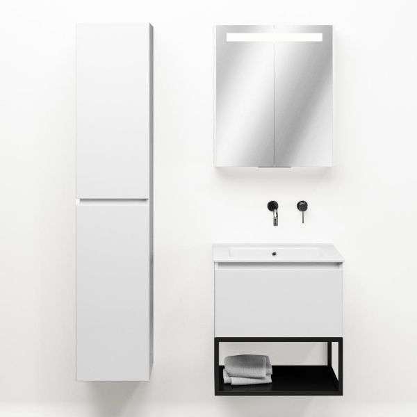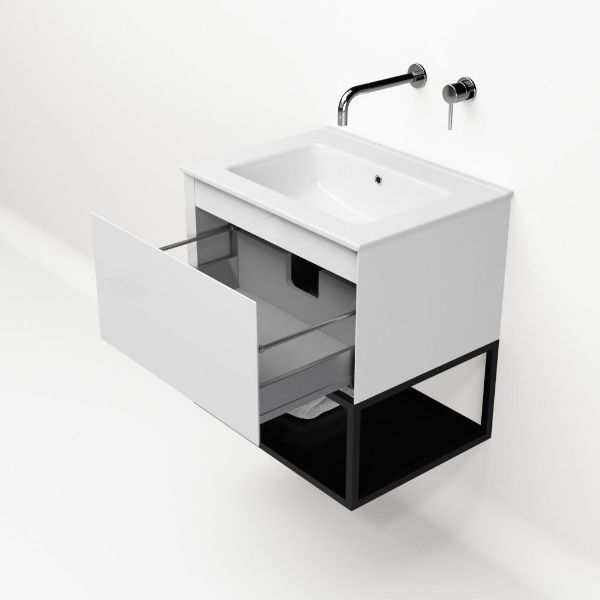 | | Bellanti Solo/Tela/Etna badmeubel 60x46 1 softclose lade wit hoogglans greeploos keramische wastafel wit zonder kraangaten met mat zwart metalen frame |