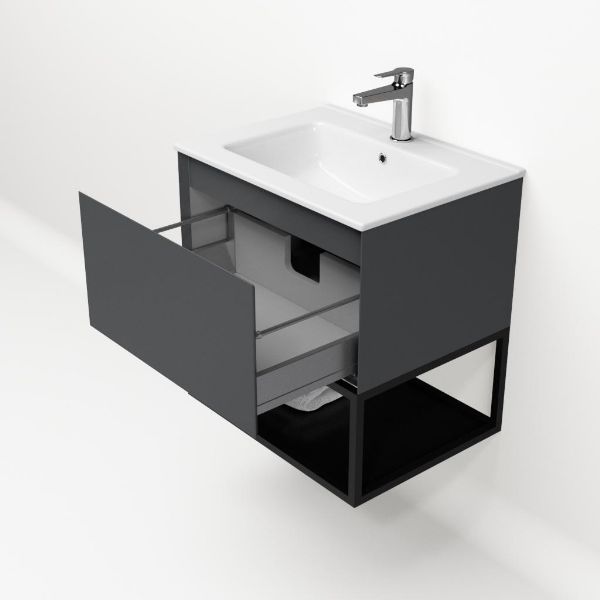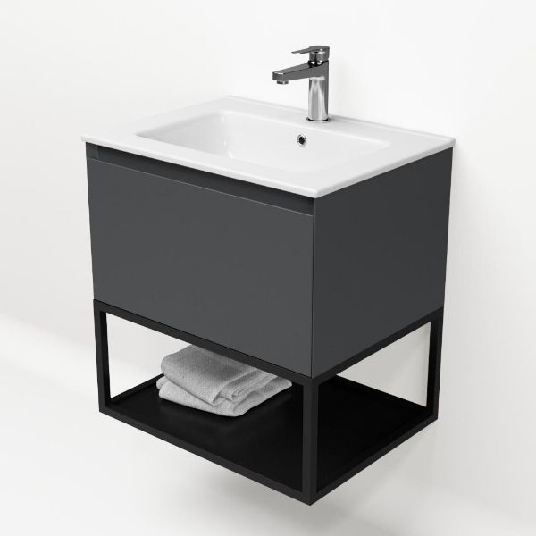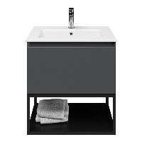 | | Bellanti Solo/Tela/Etna badmeubel 60x46 1 softclose lade antraciet mat greeploos keramische wastafel wit met 1 kraangat met mat zwart metalen frame |