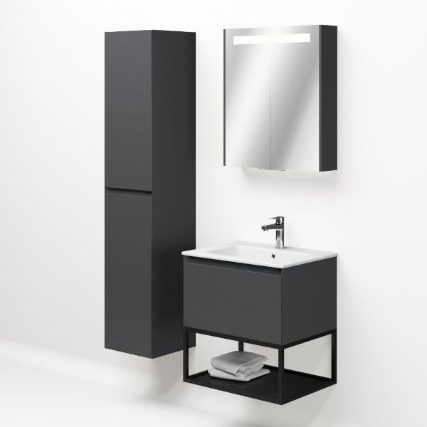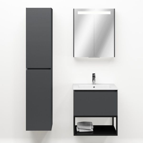 Greeploos badkamermeubel in de kleur antraciet mat is 60 cm breed. De wastafel is vervaardig in keramiek en heeft de kleur wit keramiek. Dit badkamermeubel met deze wastafel is leverbaar tussen de 60 cm t/m 120 cm