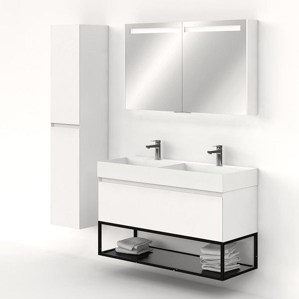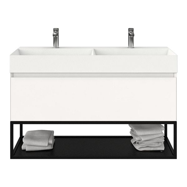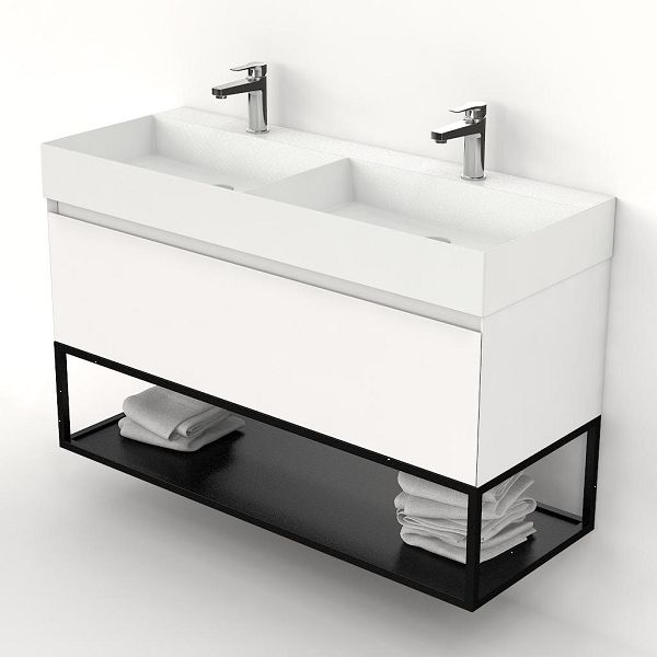 | | Bellanti Solo/Tela/Azzurra badmeubel 120x46 1 softclose lade wit mat greeploos keramische wastafel dubbel wit mat met 2 kraangaten met mat zwart metalen frame |
