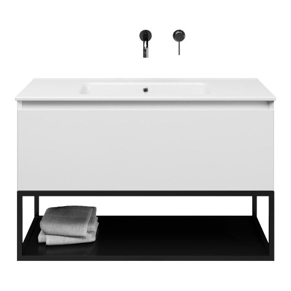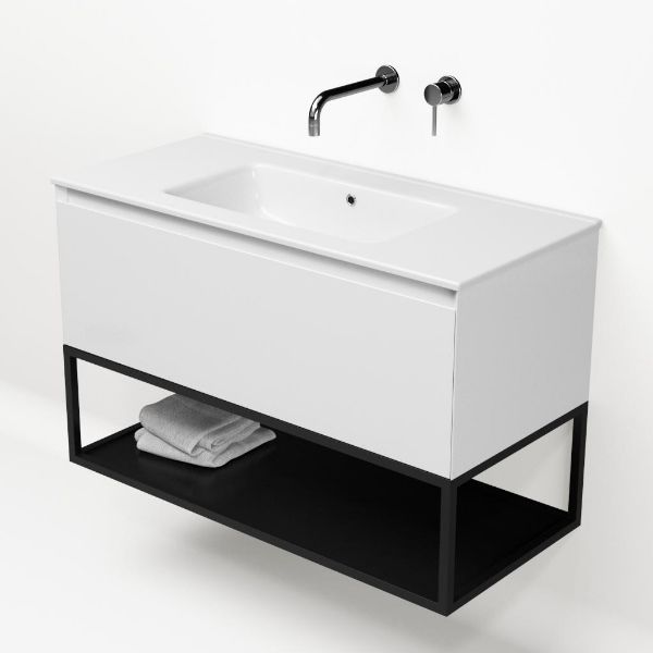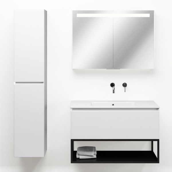 | | Bellanti Solo/Tela/Etna badmeubel 100x46 1 softclose lade wit hoogglans greeploos keramische wastafel wit zonder kraangaten met mat zwart metalen frame |