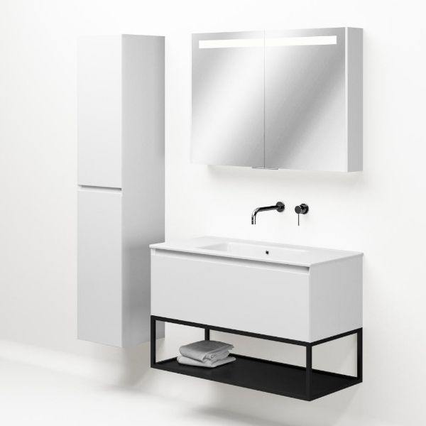 | Bellanti Solo/Tela/Etna badmeubel 100x46 1 softclose lade wit hoogglans greeploos keramische wastafel wit zonder kraangaten met mat zwart metalen frame |
