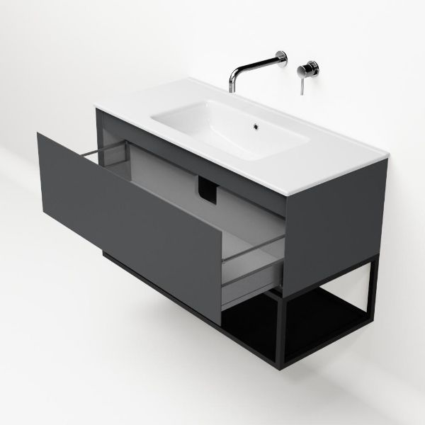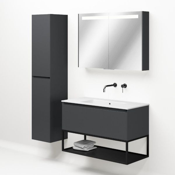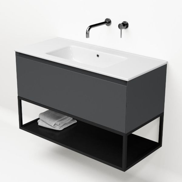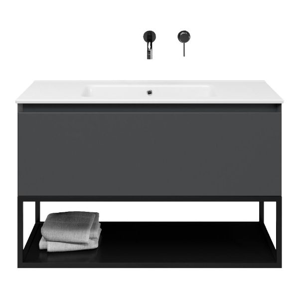 | | Bellanti Solo/Tela/Etna badmeubel 100x46 1 softclose lade antraciet mat greeploos keramische wastafel wit zonder kraangaten met mat zwart metalen frame |