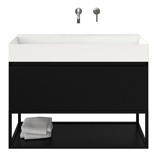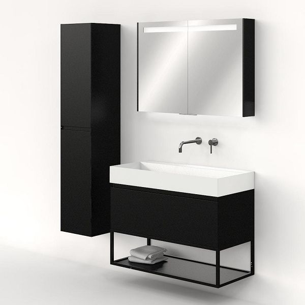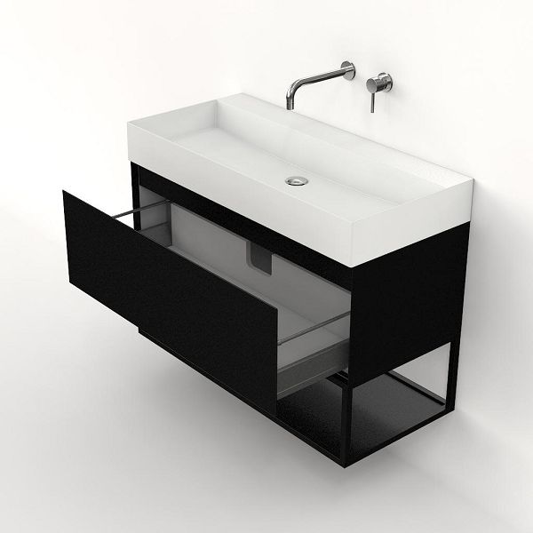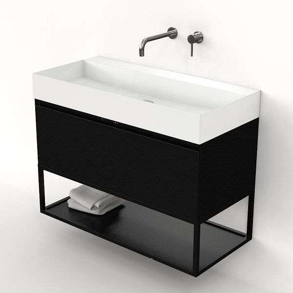 | | Bellanti Solo/Tela/Azzurra badmeubel 100x46 1 softclose lade zwart mat greeploos keramische wastafel wit glans zonder kraangaten met mat zwart metalen frame |