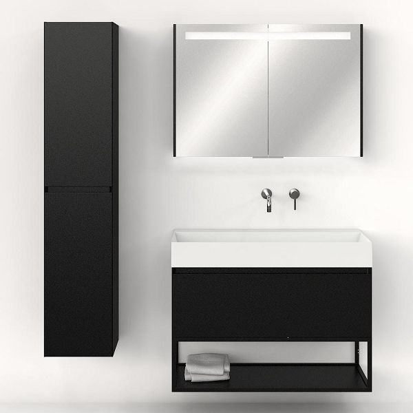 Greeploos badkamermeubel in de kleur zwart mat is 100 cm breed. De wastafel is vervaardig in keramiek en heeft de kleur wit keramiek. Dit badkamermeubel met deze wastafel is leverbaar tussen de 60 cm t/m 140 cm