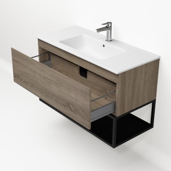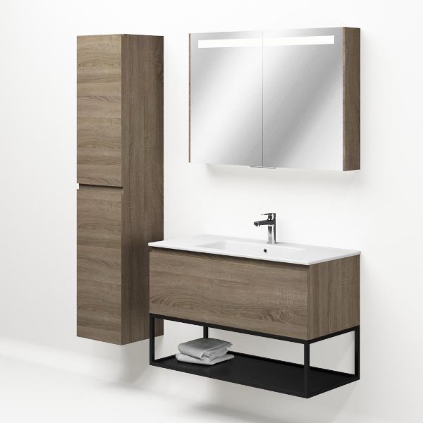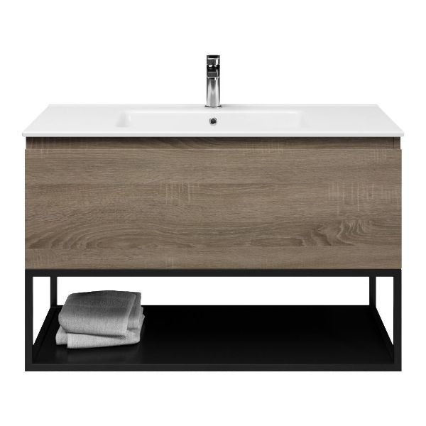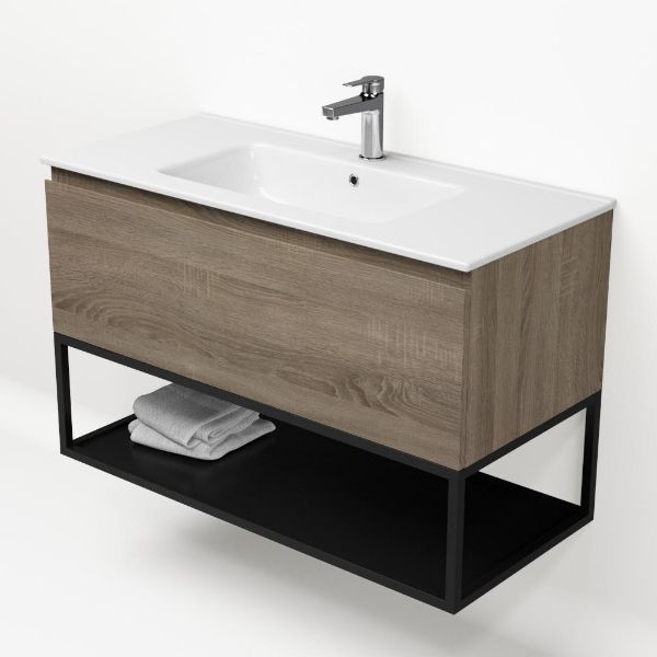 | Bellanti Solo/Tela/Etna badmeubel 100x46 1 softclose lade eiken donker greeploos keramische wastafel wit met 1 kraangat met mat zwart metalen frame |