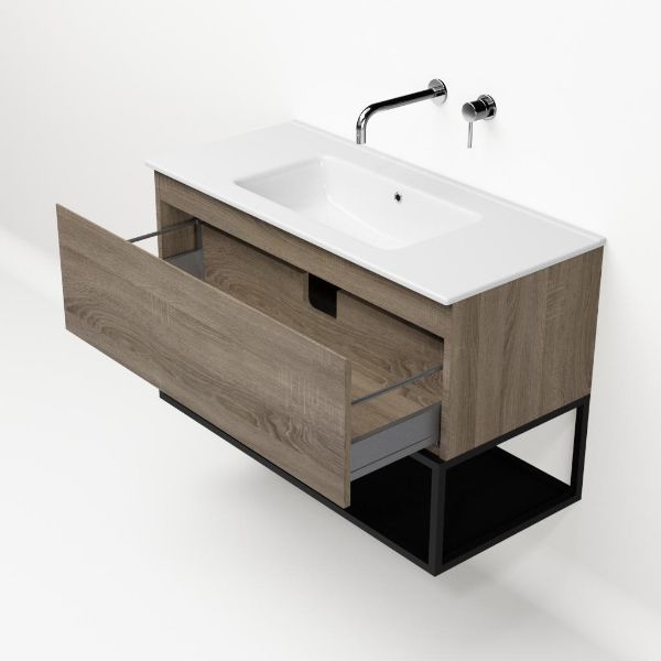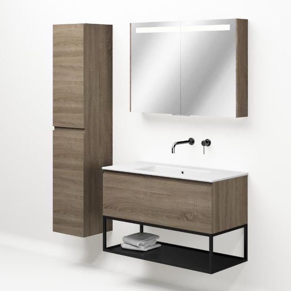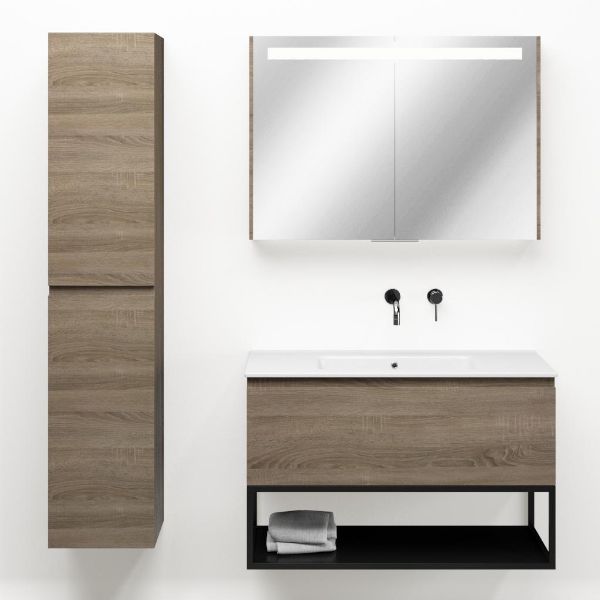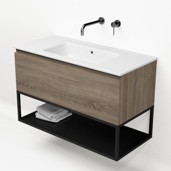 | Bellanti Solo/Tela/Etna badmeubel 100x46 1 softclose lade eiken donker greeploos keramische wastafel wit zonder kraangaten met mat zwart metalen frame |