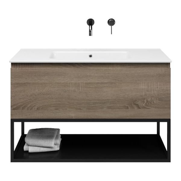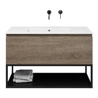 | | Bellanti Solo/Tela/Etna badmeubel 100x46 1 softclose lade eiken donker greeploos keramische wastafel wit zonder kraangaten met mat zwart metalen frame |