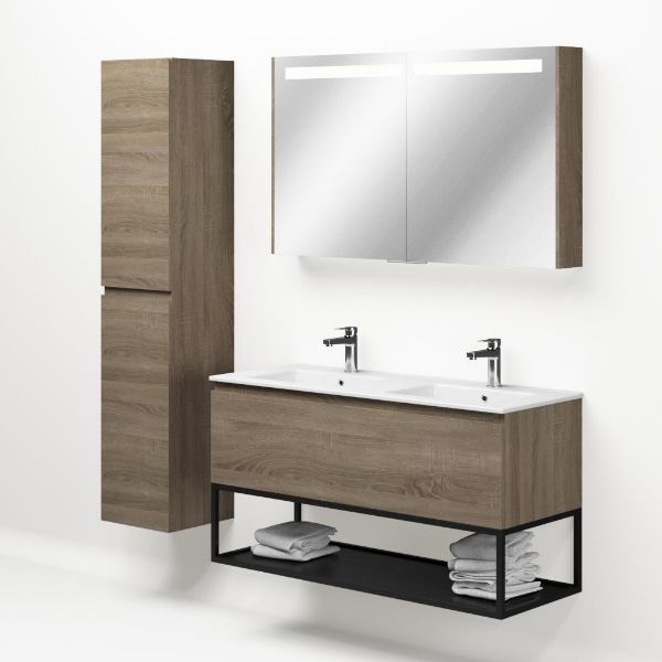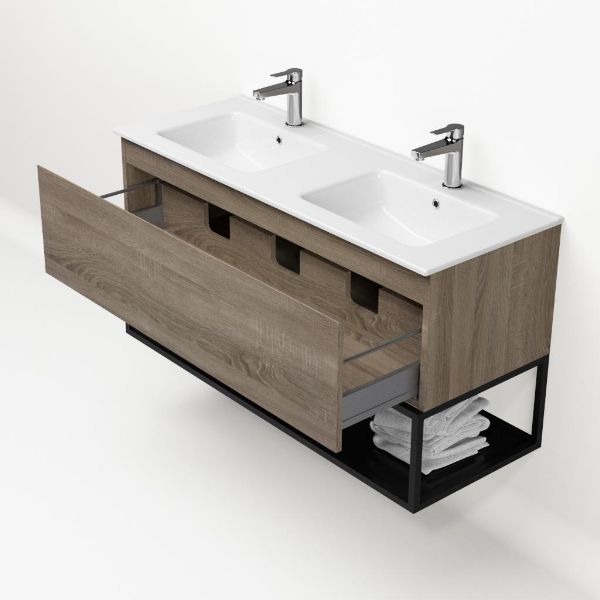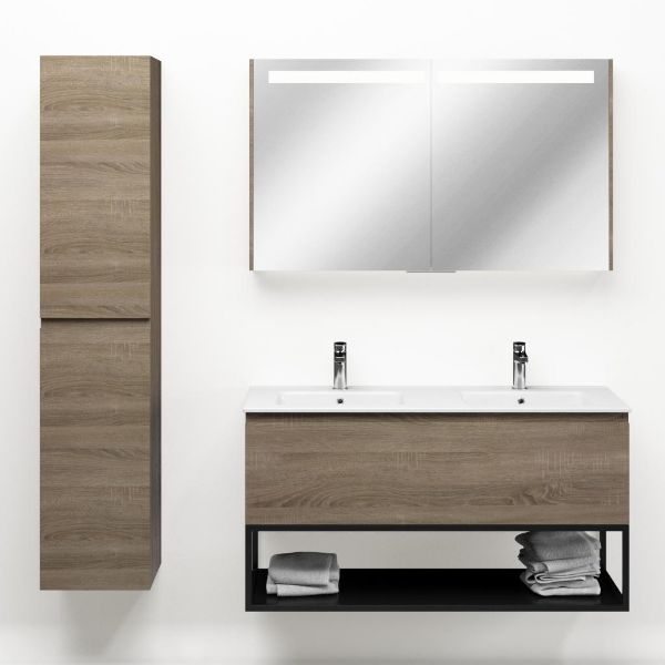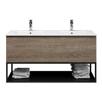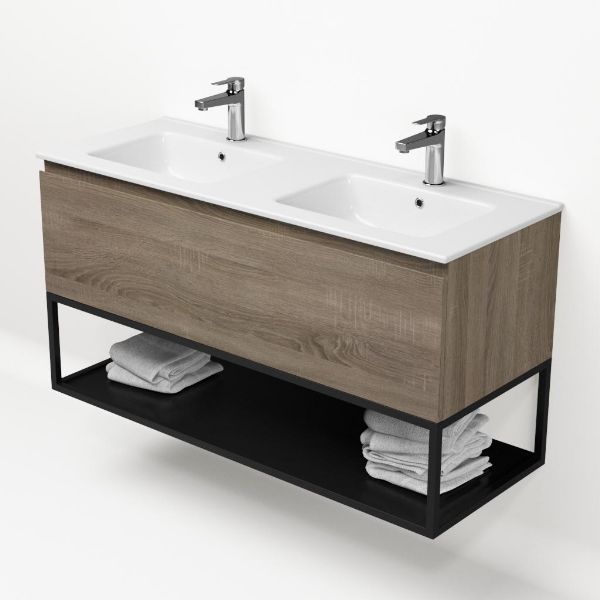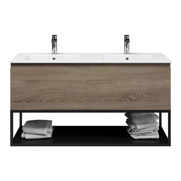 | | Bellanti Solo/Tela/Etna badmeubel 120x46 1 softclose lade eiken donker greeploos keramische wastafel dubbel wit met 2 kraangaten met mat zwart metalen frame |