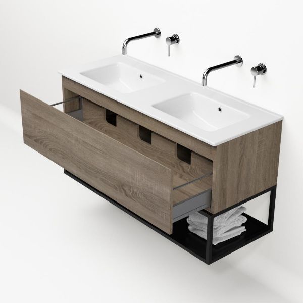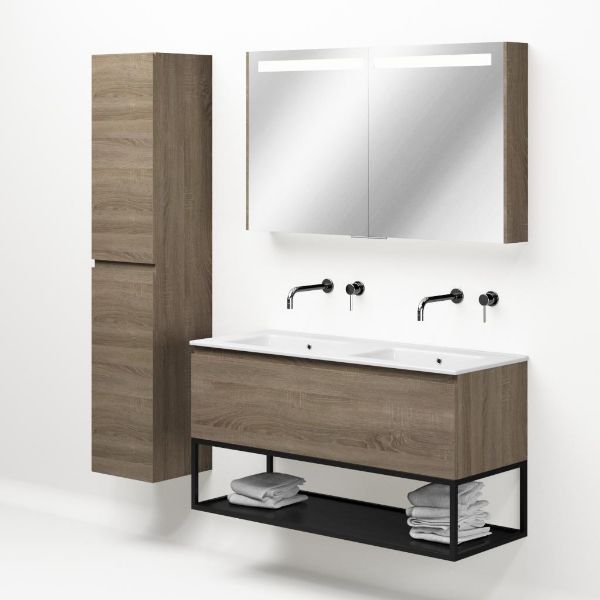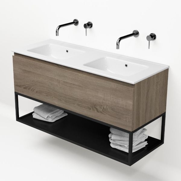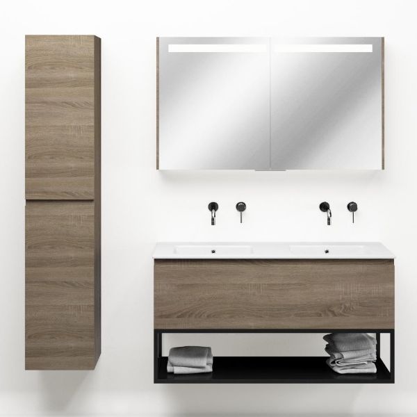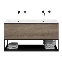 | | Bellanti Solo/Tela/Etna badmeubel 120x46 1 softclose lade eiken donker greeploos keramische wastafel dubbel wit zonder kraangaten met mat zwart metalen frame |