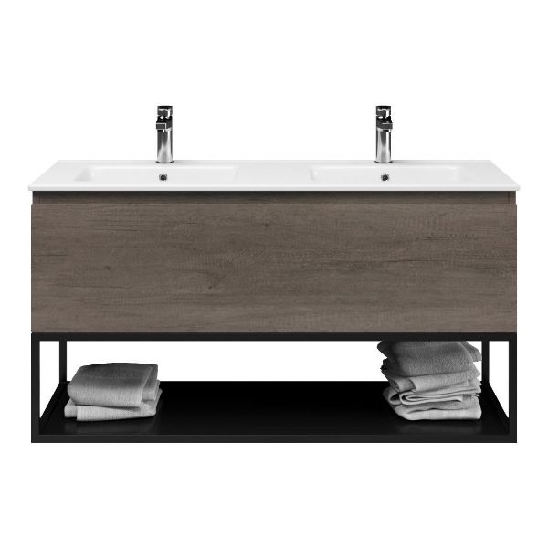 | Bellanti Solo/Tela/Etna badmeubel 120x46 1 softclose lade olm donker grijs greeploos keramische wastafel dubbel wit met 2 kraangaten met mat zwart metalen frame |