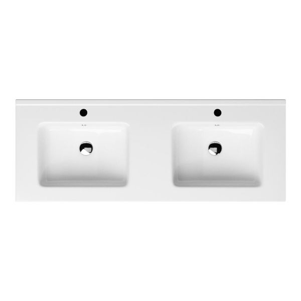 Greeploos badkamermeubel in de kleur wit hoogglans is 120 cm breed. De wastafel is vervaardig in keramiek en heeft de kleur wit keramiek. Dit badkamermeubel met deze wastafel is leverbaar tussen de 60 cm t/m 120 cm