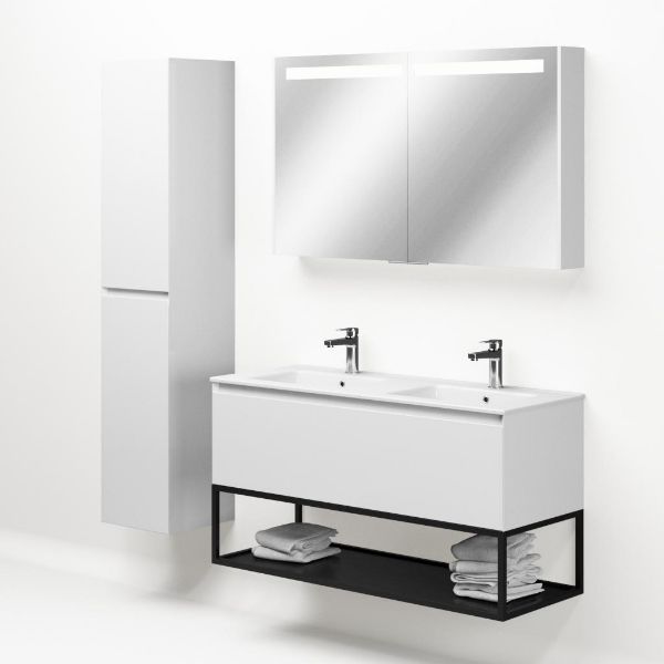 | | Bellanti Solo/Tela/Etna badmeubel 120x46 1 softclose lade wit hoogglans greeploos keramische wastafel dubbel wit met 2 kraangaten met mat zwart metalen frame |