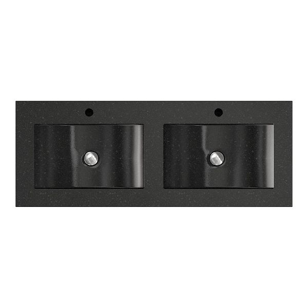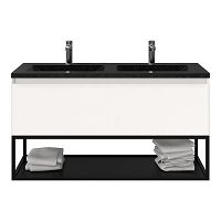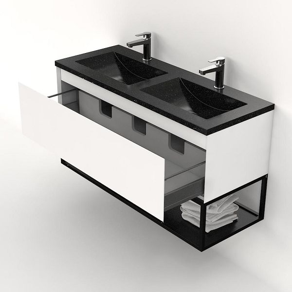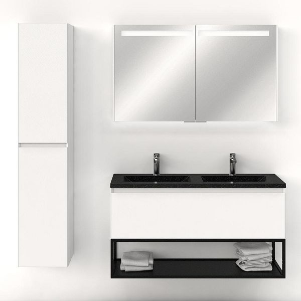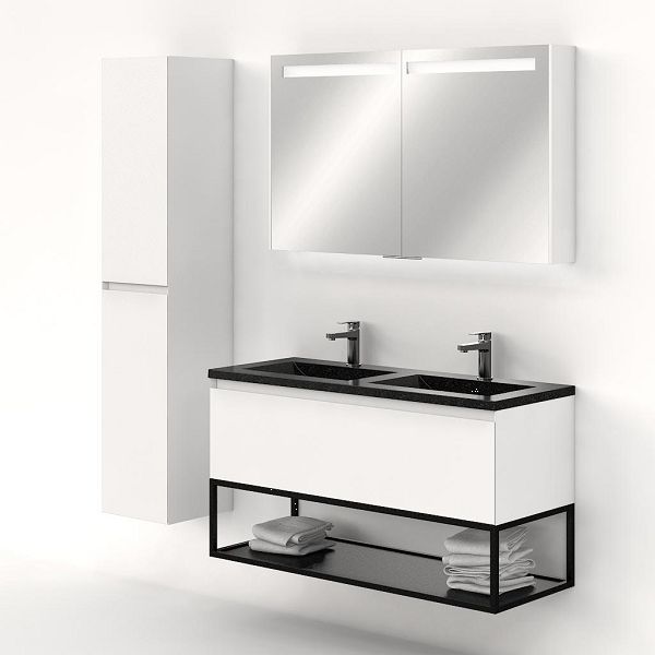 | | Bellanti Solo/Tela/Faro Stone badmeubel 120x46 1 softclose lade wit mat greeploos natuursteen wastafel dubbel blue stone met 2 kraangaten met mat zwart metalen frame |