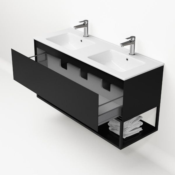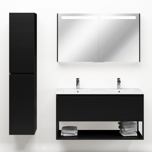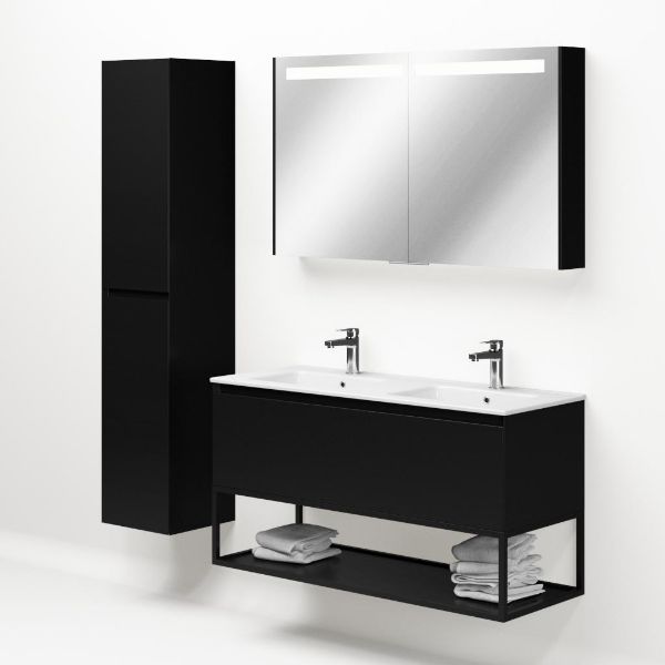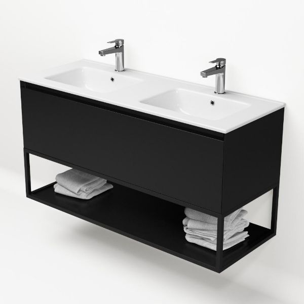| | Bellanti Solo/Tela/Etna badmeubel 120x46 1 softclose lade zwart mat greeploos keramische wastafel dubbel wit met 2 kraangaten met mat zwart metalen frame |