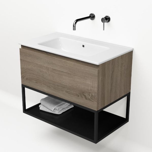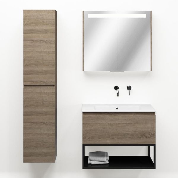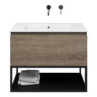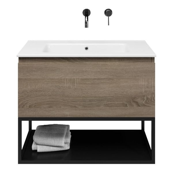 | | Bellanti Solo/Tela/Etna badmeubel 80x46 1 softclose lade eiken donker greeploos keramische wastafel wit zonder kraangaten met mat zwart metalen frame |
