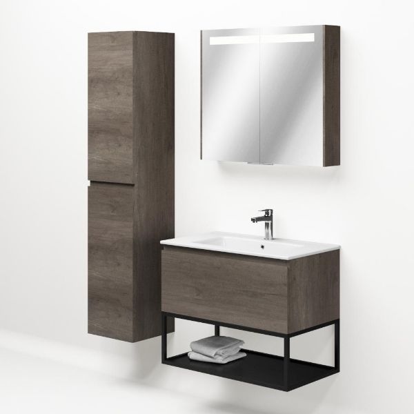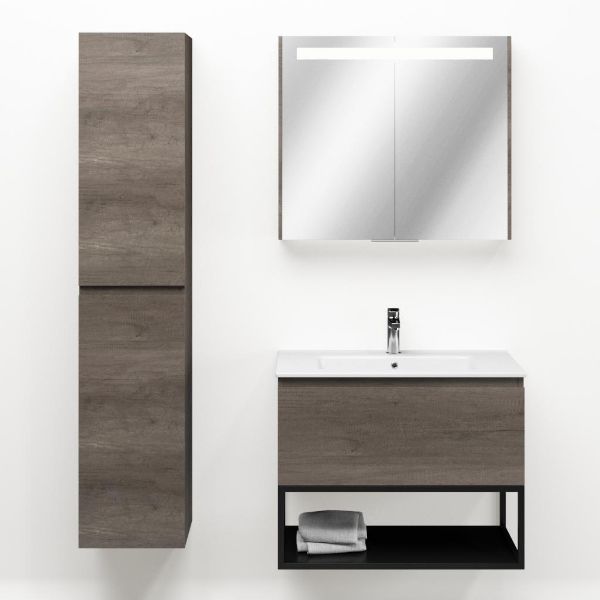 Greeploos badkamermeubel in de kleur olm donker grijs is 80 cm breed. De wastafel is vervaardig in keramiek en heeft de kleur wit keramiek. Dit badkamermeubel met deze wastafel is leverbaar tussen de 60 cm t/m 120 cm