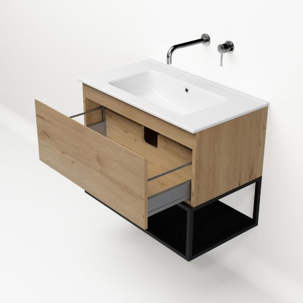 | Bellanti Solo/Tela/Etna badmeubel 80x46 1 softclose lade eiken natuur greeploos keramische wastafel wit zonder kraangaten met mat zwart metalen frame |