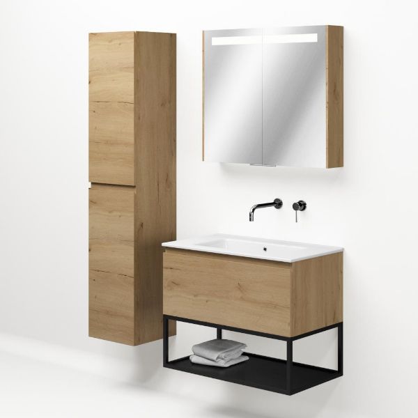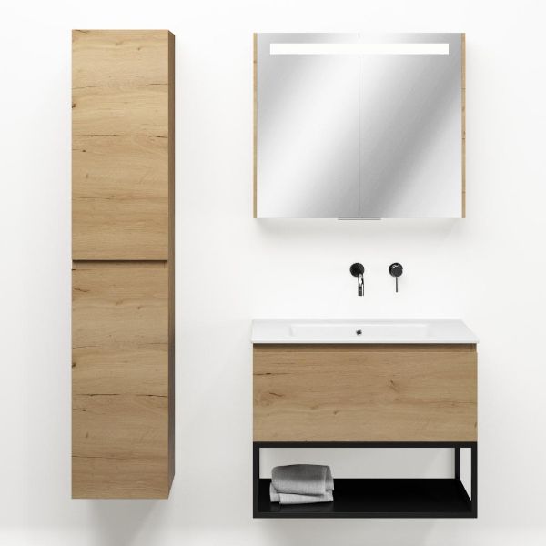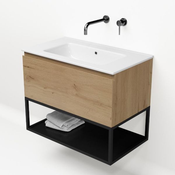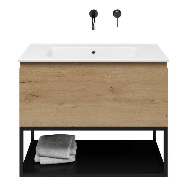 | | Bellanti Solo/Tela/Etna badmeubel 80x46 1 softclose lade eiken natuur greeploos keramische wastafel wit zonder kraangaten met mat zwart metalen frame |