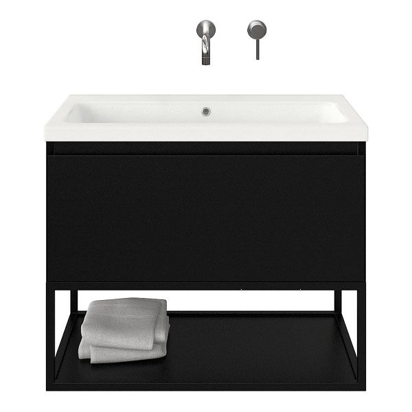 | | Bellanti Solo/Tela/Amelia badmeubel 80x46 1 softclose lade zwart mat greeploos keramische wastafel wit mat zonder kraangaten met mat zwart metalen frame |