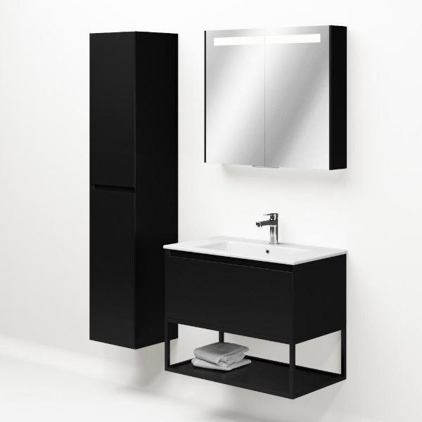 Greeploos badkamermeubel in de kleur zwart mat is 80 cm breed. De wastafel is vervaardig in keramiek en heeft de kleur wit keramiek. Dit badkamermeubel met deze wastafel is leverbaar tussen de 60 cm t/m 120 cm