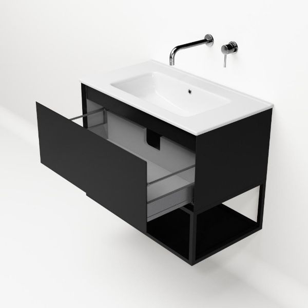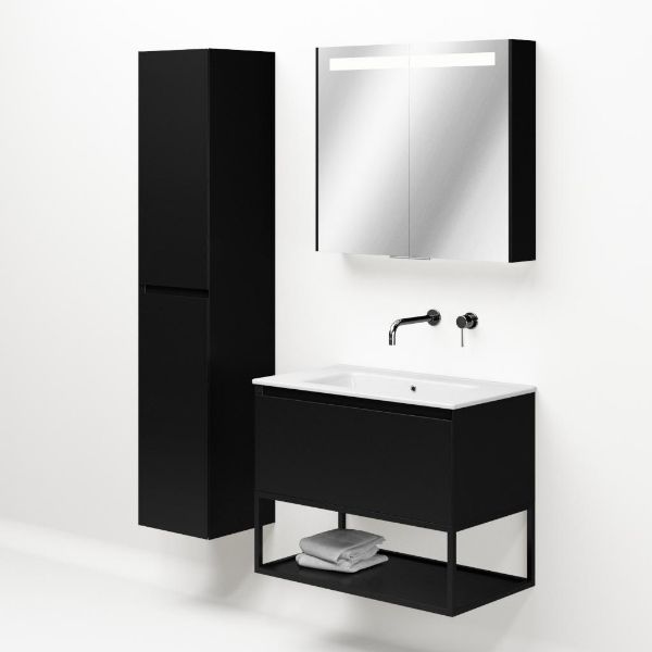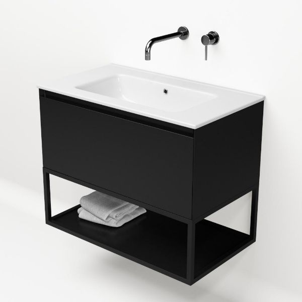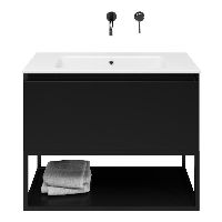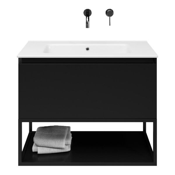 | | Bellanti Solo/Tela/Etna badmeubel 80x46 1 softclose lade zwart mat greeploos keramische wastafel wit zonder kraangaten met mat zwart metalen frame |