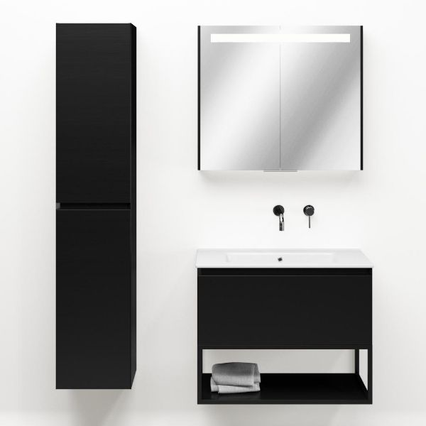 Greeploos badkamermeubel in de kleur zwart mat is 80 cm breed. De wastafel is vervaardig in keramiek en heeft de kleur wit keramiek. Dit badkamermeubel met deze wastafel is leverbaar tussen de 60 cm t/m 120 cm