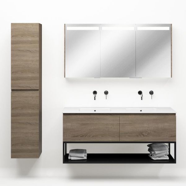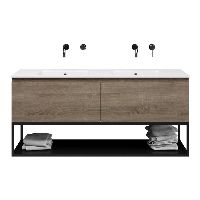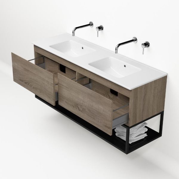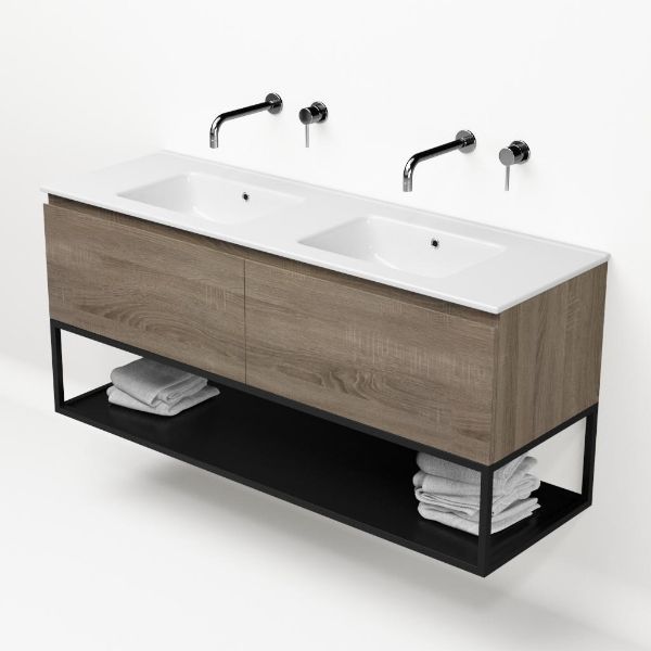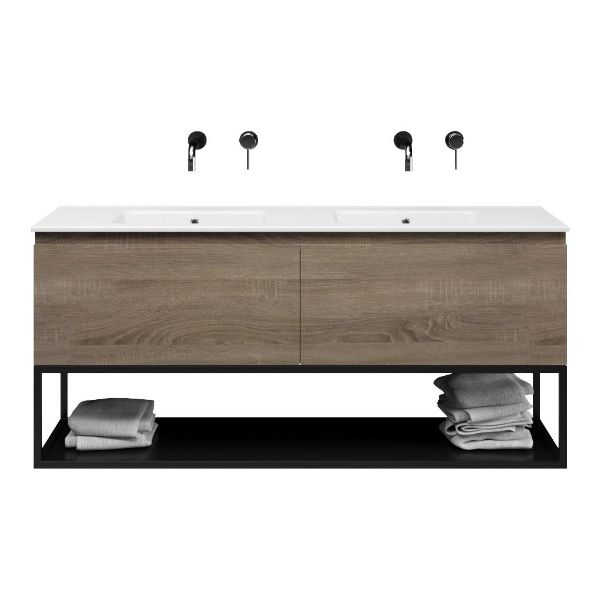 | Bellanti Solo/Tela/Etna badmeubel 140x46 2 softclose laden eiken donker greeploos keramische wastafel dubbel wit zonder kraangat met mat zwart metalen frame |