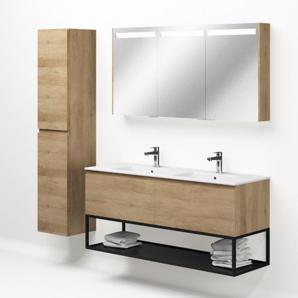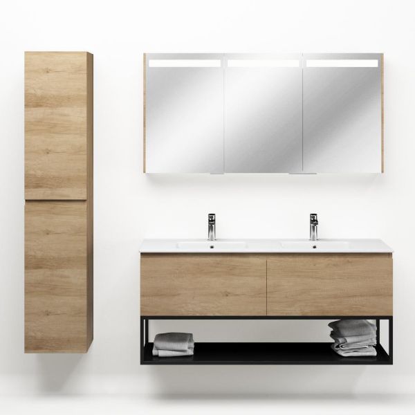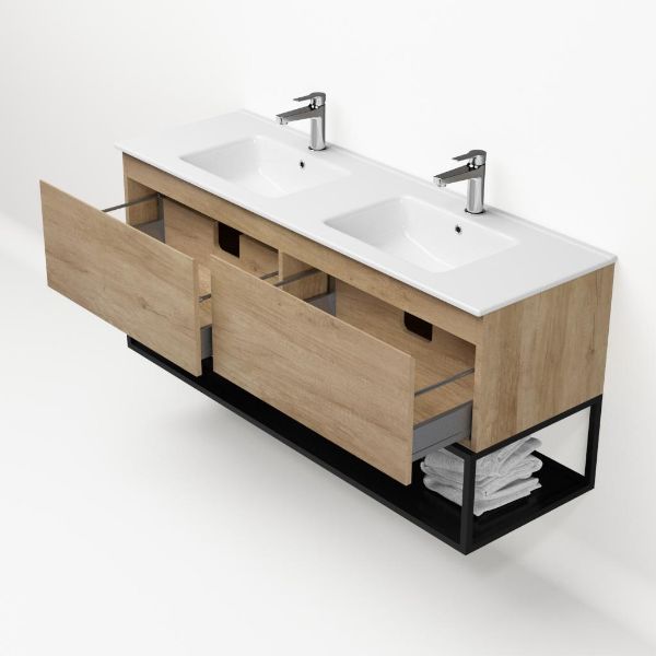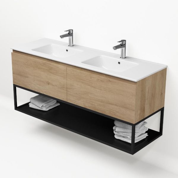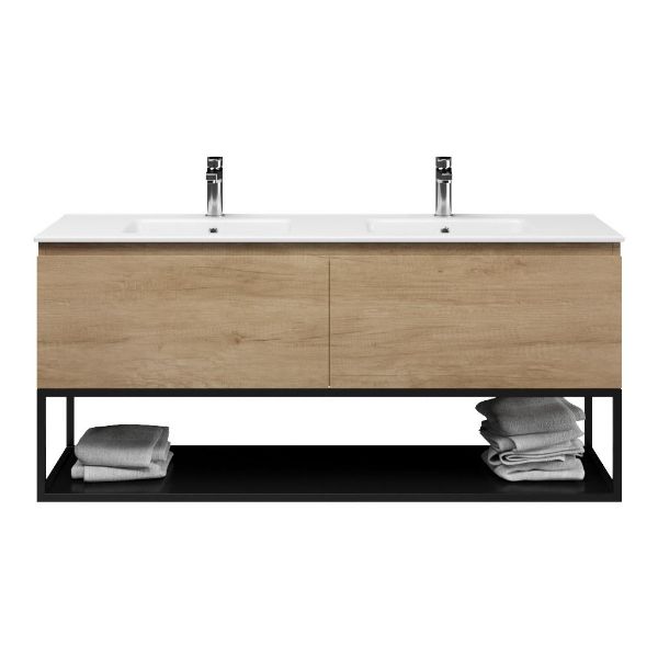 | Bellanti Solo/Tela/Etna badmeubel 140x46 2 softclose laden olm greeploos keramische wastafel dubbel wit met 2 kraangaten met mat zwart metalen frame |