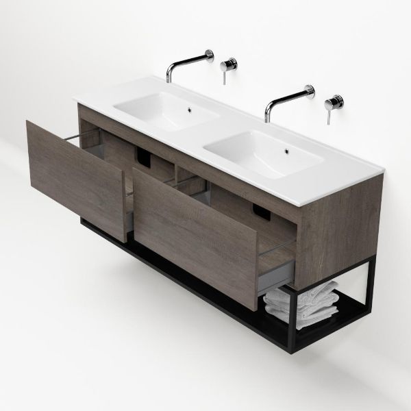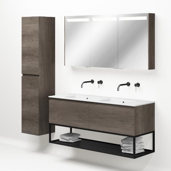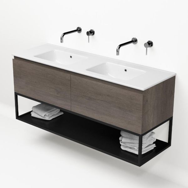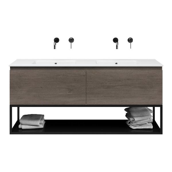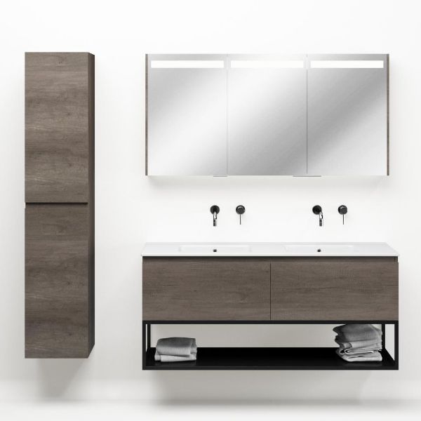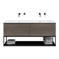 | Bellanti Solo/Tela/Etna badmeubel 140x46 2 softclose laden olm donker grijs greeploos keramische wastafel dubbel wit zonder kraangat met mat zwart metalen frame |