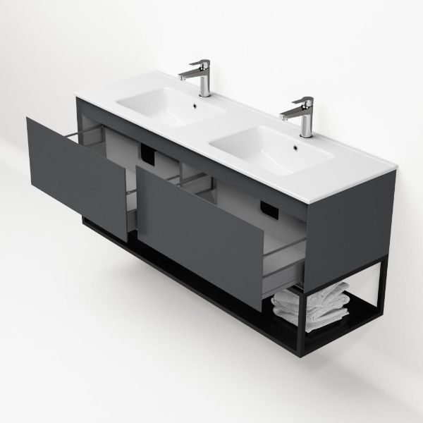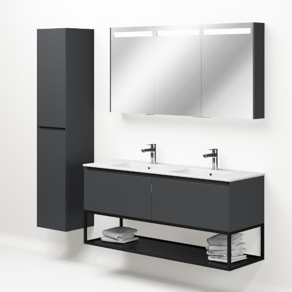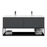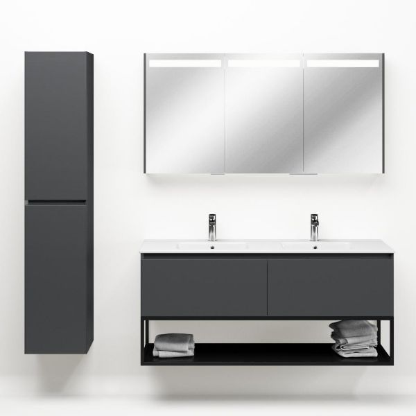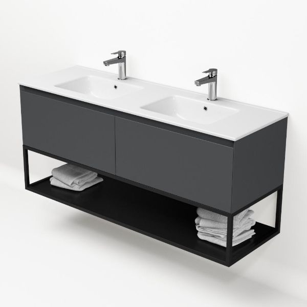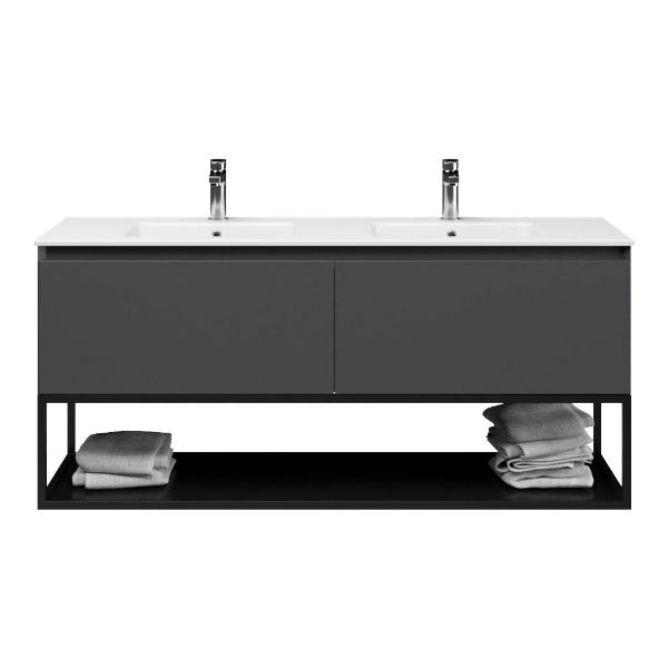 | Bellanti Solo/Tela/Etna badmeubel 140x46 2 softclose laden antraciet mat greeploos keramische wastafel dubbel wit met 2 kraangaten met mat zwart metalen frame |