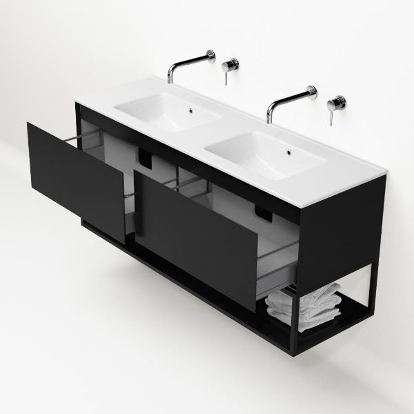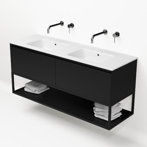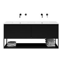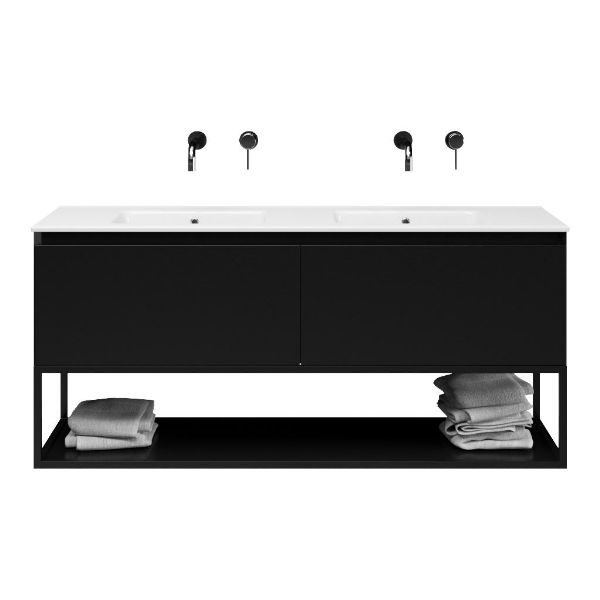 | | Bellanti Solo/Tela/Etna badmeubel 140x46 2 softclose laden zwart mat greeploos keramische wastafel dubbel wit zonder kraangat met mat zwart metalen frame |