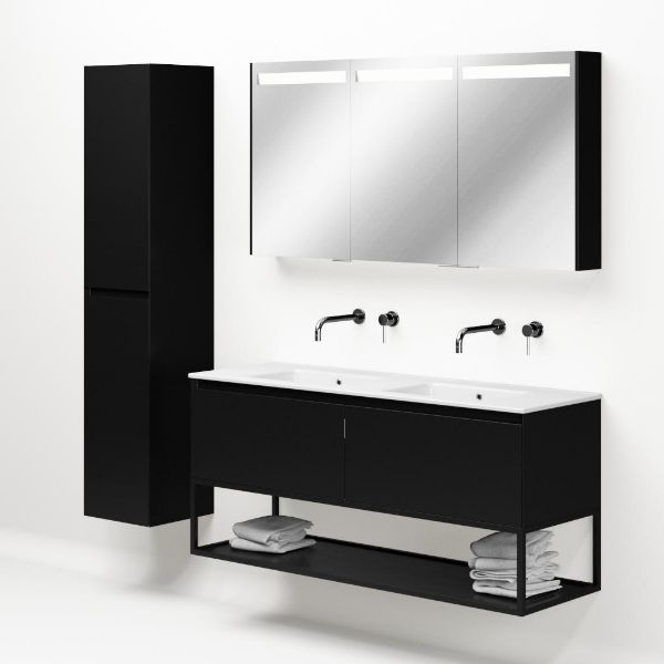 Greeploos badkamermeubel in de kleur zwart mat is 140 cm breed. De wastafel is vervaardig in keramiek en heeft de kleur wit keramiek. Dit badkamermeubel met deze wastafel is leverbaar tussen de 60 cm t/m 120 cm