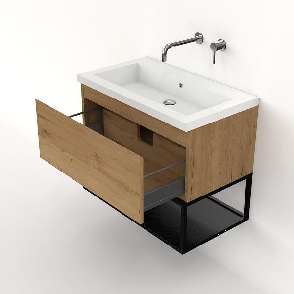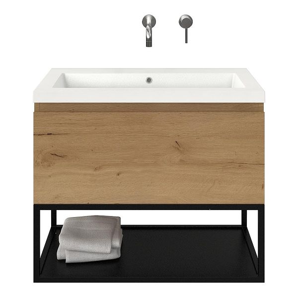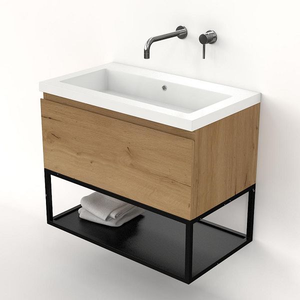 Bellanti Solo/Tela/Esta badmeubel 80x46 1 softclose lade eiken natuur greeploos polystone wastafel wit zonder kraangaten met mat zwart metalen frame