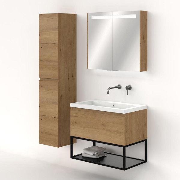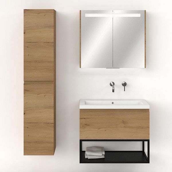 Greeploos badkamermeubel in de kleur eiken natuur is 80 cm breed.  De wastafel is vervaardig in polystone en heeft de kleur wit. Dit badkamermeubel met deze wastafel is leverbaar tussen de 60 cm t/m 160 cm