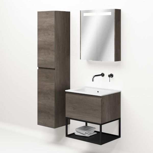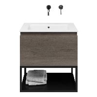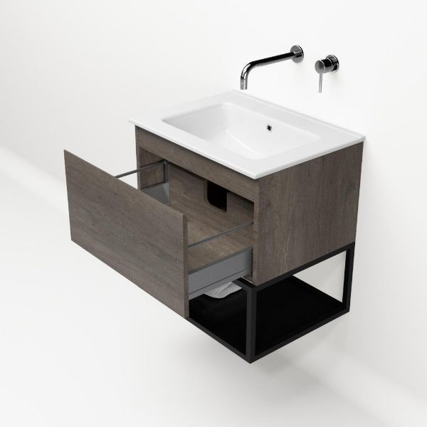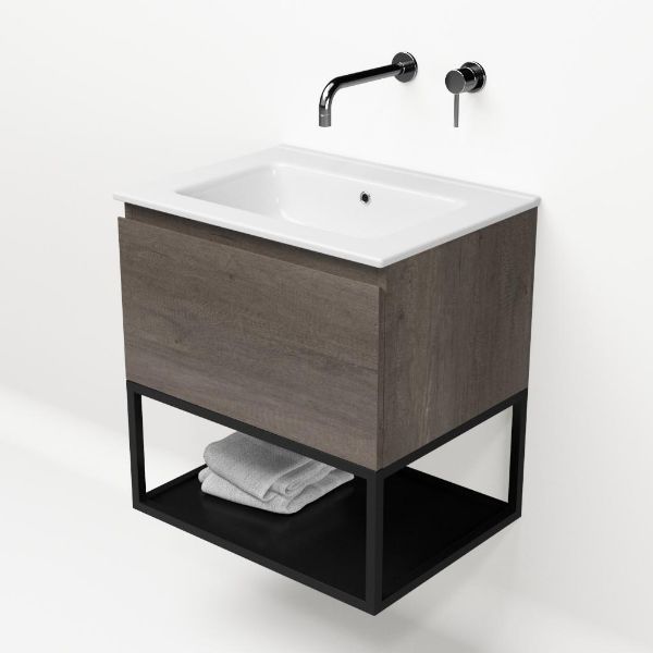 | | Bellanti Solo/Tela/Etna badmeubel 60x46 1 softclose lade olm donker grijs greeploos keramische wastafel wit zonder kraangaten met mat zwart metalen frame |