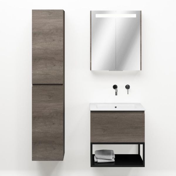 Greeploos badkamermeubel in de kleur olm donker grijs is 60 cm breed. De wastafel is vervaardig in keramiek en heeft de kleur wit keramiek. Dit badkamermeubel met deze wastafel is leverbaar tussen de 60 cm t/m 120 cm