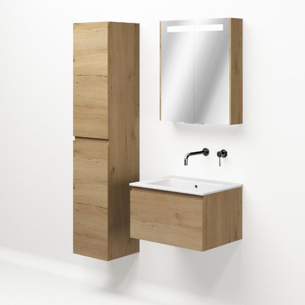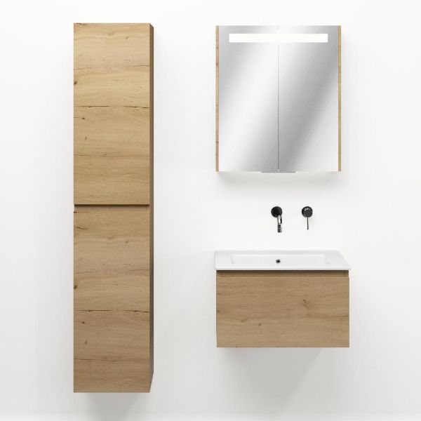 Greeploos badkamermeubel in de kleur eiken natuur is 60 cm breed. De wastafel is vervaardig in keramiek en heeft de kleur wit keramiek. Dit badkamermeubel met deze wastafel is leverbaar tussen de 60 cm t/m 120 cm